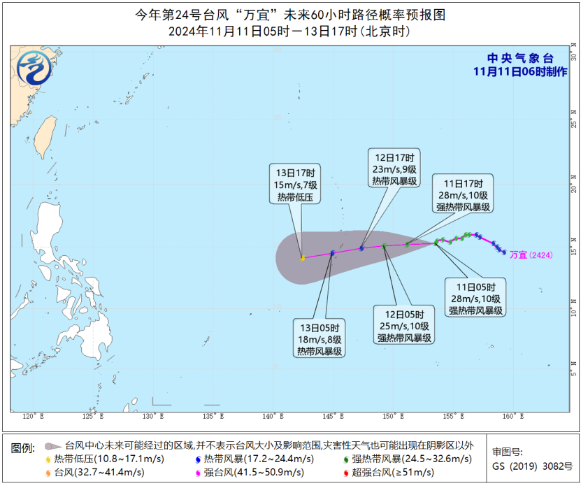 此外,今年第24号台风“万宜”(强热带风暴级)的中心今天早晨5点钟位于美国关岛东偏北方向约960公里的洋面上,就是北纬15.3度、东经153.5度,中心附近最大风力10级(28米/秒),中心最低气压982百帕,七级风圈半径80至120公里,十级风圈半径20至30公里。