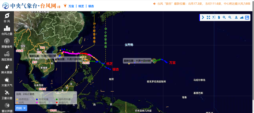 台风“银杏”减弱为热带风暴级 “桃芝”加强为台风级 “万宜”继续向偏西方向移动