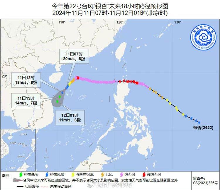 记者11日上午从海南省气象部门了解到,今年第22号台风“银杏”已减弱为热带风暴级,11日07时其中心在距离永兴岛西偏北方向约95公里的海面上。“银杏”将于今天白天穿过西沙群岛一带海面,强度逐渐减弱,并趋向于越南南部沿海。海南省气象局于11月11日06时40分继续发布台风四级预警(海上)。