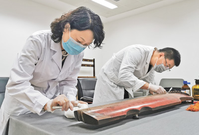 辽宁省博物馆工作人员在对九霄环佩琴进行保养。九霄环佩琴制作于唐代。在古琴琴底,镌刻着“九霄环佩”四个字。琴面上,镶嵌着13个由蚌壳制成的圆点,起到标记琴弦音位的作用。