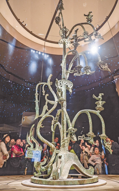 四川广汉三星堆博物馆内,观众围在Ⅰ号大型铜神树前仔细观看。Ⅰ号大型铜神树由底座、树和龙三部分组成,体现了高超的冶铸技术和艺术水平。
