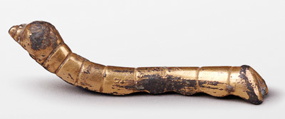 鎏金铜蚕。1984年出土于陕西安康石泉县,体态为蚕仰头或吐丝状,制作精致,造型逼真,见证了开辟丝绸之路的历史。