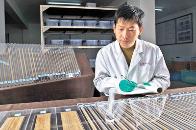 甘肃简牍博物馆的工作人员在文物库房内查看简牍保存情况。