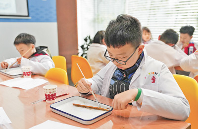 孩子们在湖南长沙简牍博物馆参与“探秘简牍的清洗与保护”活动。