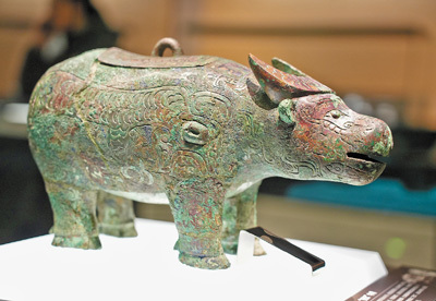 河南安阳殷墟博物馆内展出的亚长牛尊,是目前殷墟发现的唯一一件牛形青铜尊。