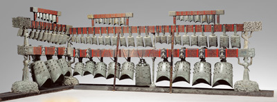 曾侯乙编钟。1978年出土于湖北随县(今随州市)曾侯乙墓,战国时期青铜乐器的巅峰之作,编钟的钟体、钟架和挂钟构件上共有3755字铭文,包含了丰富的乐律学知识。