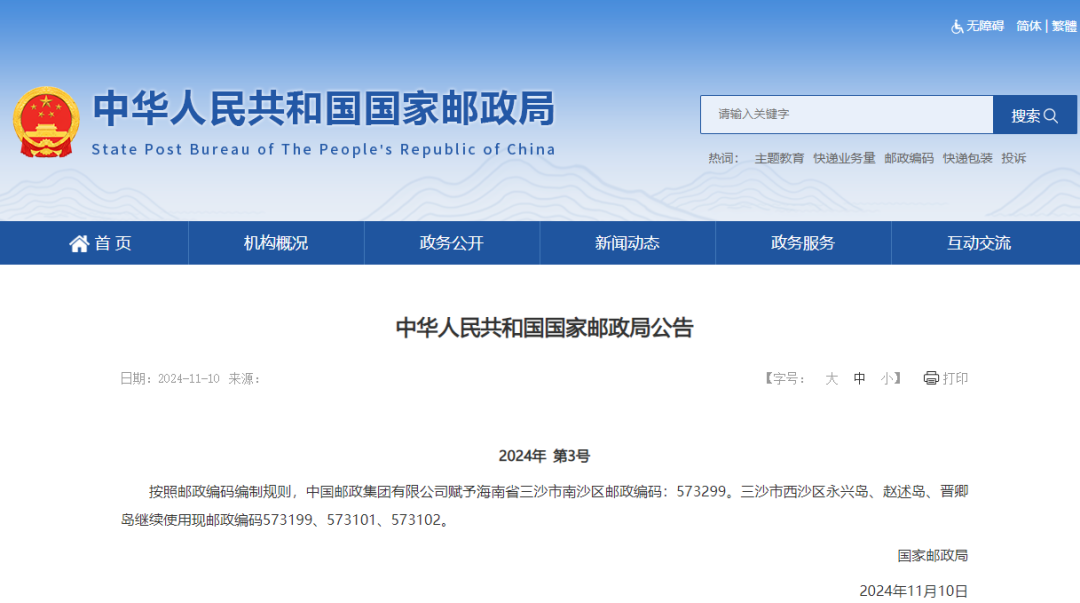 11月10日,国家邮政局发布公告,按照邮政编码编制规则,中国邮政集团有限公司赋予海南省三沙市南沙区邮政编码:573299。 三沙市西沙区永兴岛、赵述岛、晋卿岛继续使用现邮政编码573199、573101、573102。 来源 |国家邮政局网站