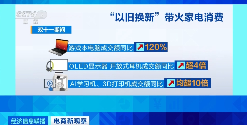 某电商平台数据显示,“双十一”期间游戏本电脑成交额同比增长120%。OLED显示器、开放式耳机成交额同比增长超4倍。AI学习机、3D打印机成交额同比增长均超10倍。