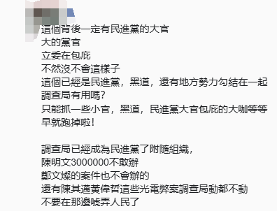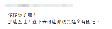 岛内网友在联合新闻网留言批评,“有用吗?自己查自己”“调查局已经成为民进党的附随组织,民进党籍前民意代表陈明文不敢办,台行政机构前副负责人郑文灿的案件也不会办,还有民进党籍高雄市长陈其迈、民进党籍台南市长黄伟哲这些光电弊案,‘调查局’动都不动,不要在那边糊弄民众了”“(侦办)做做样子啦!那能查吗?”