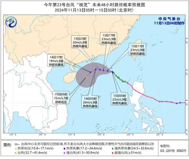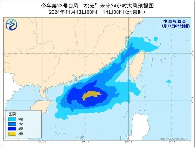 大风预报:13日08时至14日08时,东海西南部、台湾海峡、巴士海峡、南海北部、东沙群岛、广东中部和东部沿海、福建沿海将有6-7级,阵风8-9级的大风,“桃芝”中心经过的附近海域风力可达8-9级,阵风10-11级。