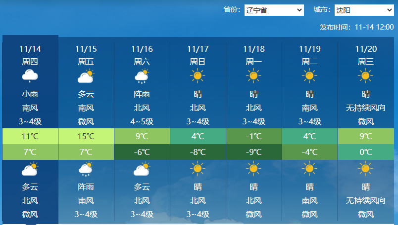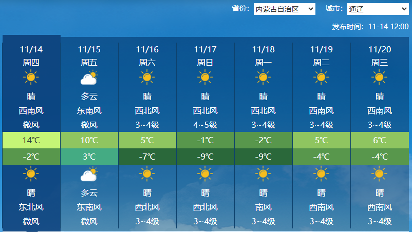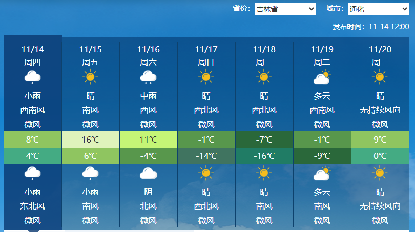 去看了下未来的气温预报,在内蒙古通辽、吉林通化、辽宁沈阳,温暖和寒冷真的是快速切换,朋友们记得及时增添衣物!