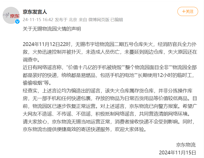 经查实,上述言论均为编造出的谣言,该失火仓库属存货仓库,并非分拣操作库房,无一部手机和任何快递包裹,存放的物品为日常百货用品等价值较低商品。目前,物流园区已逐步恢复正常运营。对上述谣言,京东物流已向警方报案。希望广大网友不造谣、不传谣、不信谣,积极抵制网络谣言,共同营造清朗网络环境。
