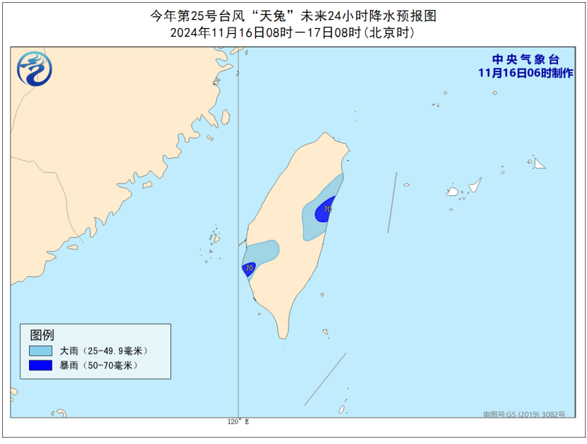 降水预报:16日08时至17日08时,台湾岛部分地区将有大到暴雨(50-70毫米)。