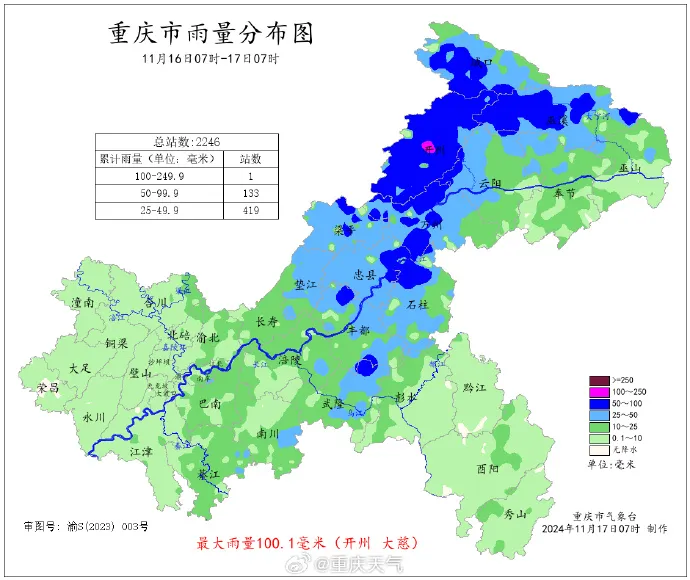 其中,开州大慈(100.1毫米)大暴雨,丰都、梁平、忠县、万州、开州、云阳、城口、巫溪、武隆、石柱等10个区县的133个雨量站暴雨;最大小时雨量18.4毫米(云阳铁炉,16日23时)。梁平、万州、奉节、巫溪、巫山、黔江等6个区县局地出现8级以上阵性大风,最大风速19.4米/秒(8级,奉节新家,16日23时)。部分地区有雨雾。