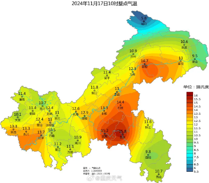 实况监测,上午10时,重庆各地气温均不足16℃,酉阳、巫山、城口仅个位数气温,最冷城口低至5.8℃!渝北也只有11℃!