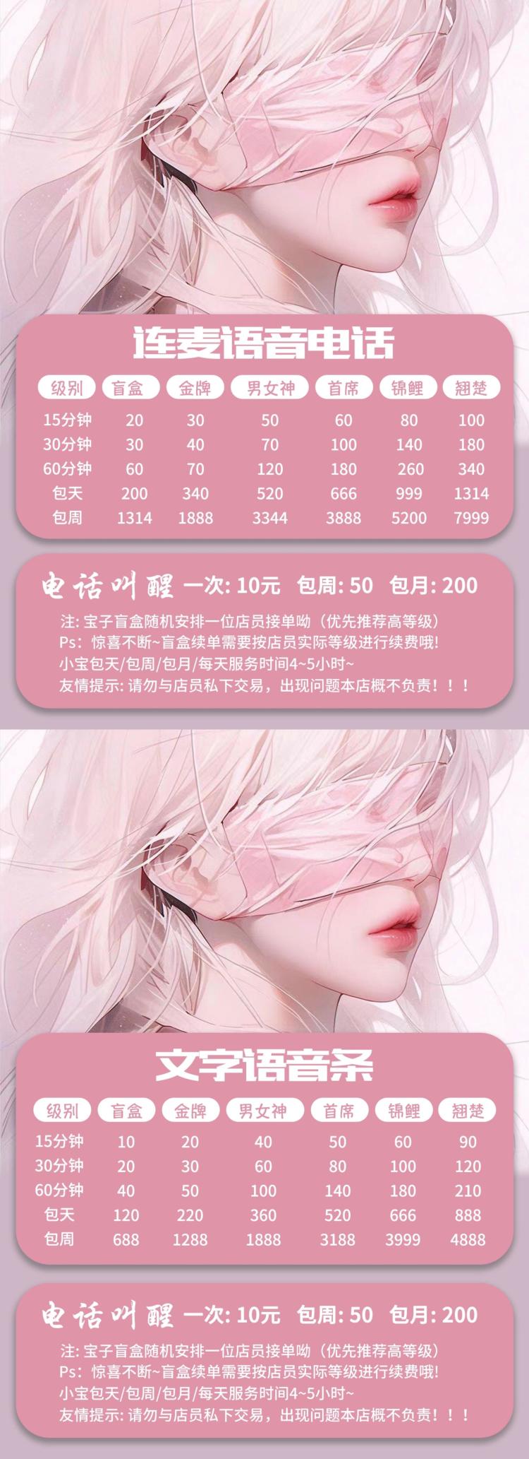 某店铺客服发来的一张表格中显示,此类服务消费,价格差异很大,陪聊人员分为“盲盒、金牌、男女神、首席、锦鲤和翘楚”不同级别,级别越高价格越贵。此外还分不同服务时长,从15分钟到包周都有,有的店铺包月的费用最高达3万多元。