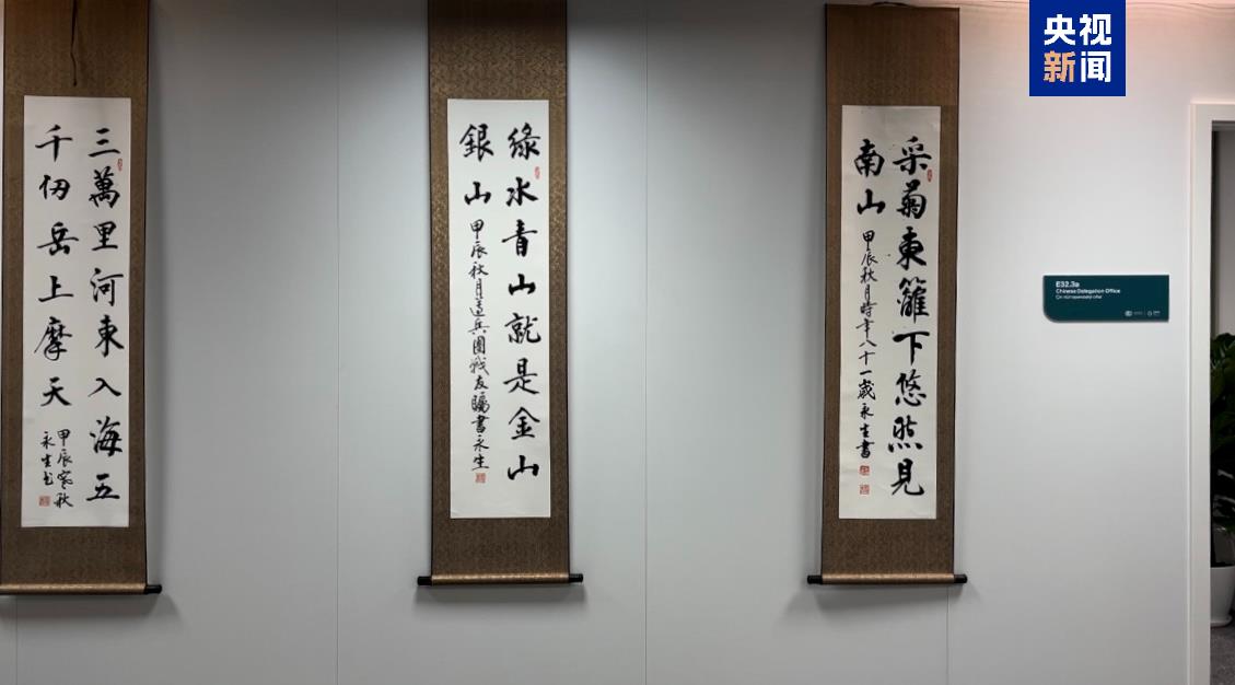 △ 第29届联合国气候变化大会中国代表团办公室里挂的三幅字