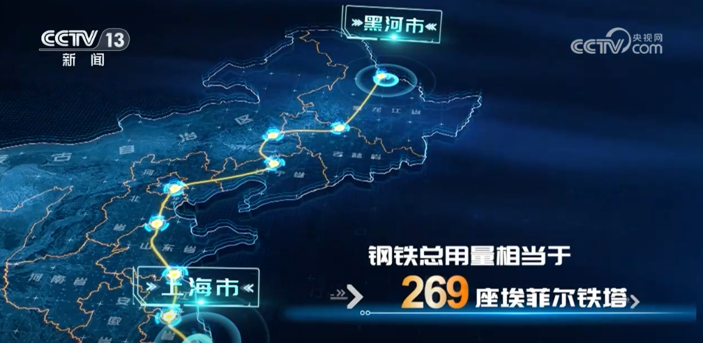 管道全长5111公里,北起黑龙江省黑河市,途经9个省、自治区、直辖市,南至上海。其中,新建管道3371公里,钢铁总用量相当于280座埃菲尔铁塔。