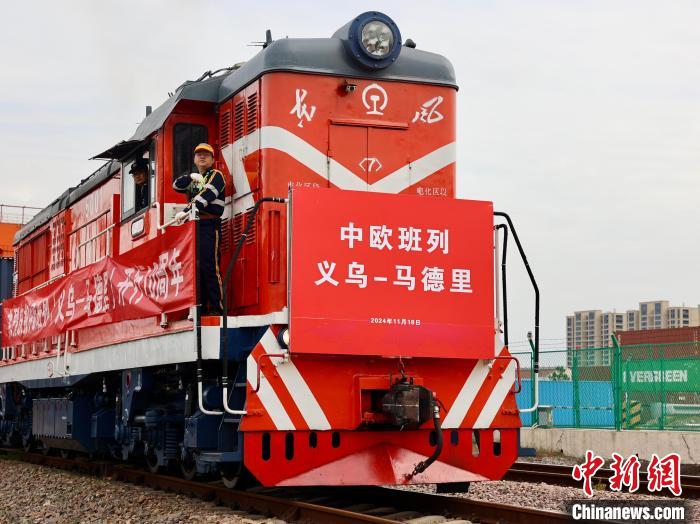 中新社浙江义乌11月18日电 (尹倩芸 董易鑫)一趟满载110个标准箱日用百货、汽车配件、机械设备等出口货物的中欧班列18日从铁路义乌西站驶出,驶往逾1.3万公里外的西班牙马德里。当日,义乌中欧班列迎来开行十周年。