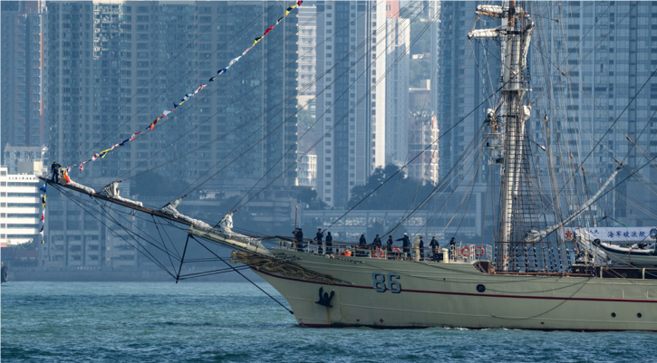 据报道,18日早上8时许,“破浪号”由香港东面水域驶入维多利亚港,由驻港军舰宿迁舰领航,船上海军学员攀上约50至60米高桅杆上展示国际海军通行的“站桅礼” ,历时约20分钟。之后“破浪号”驶至驻港部队昂船洲军营停靠。