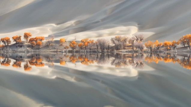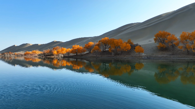 近日,新疆尉犁县罗布湖风景游览区。罗布湖宛如一面明镜,映照出周围景色的倒影,绵延的沙丘、金色的胡杨、碧蓝的天空,与湖面的镜像世界构成一幅绝美的自然画卷。