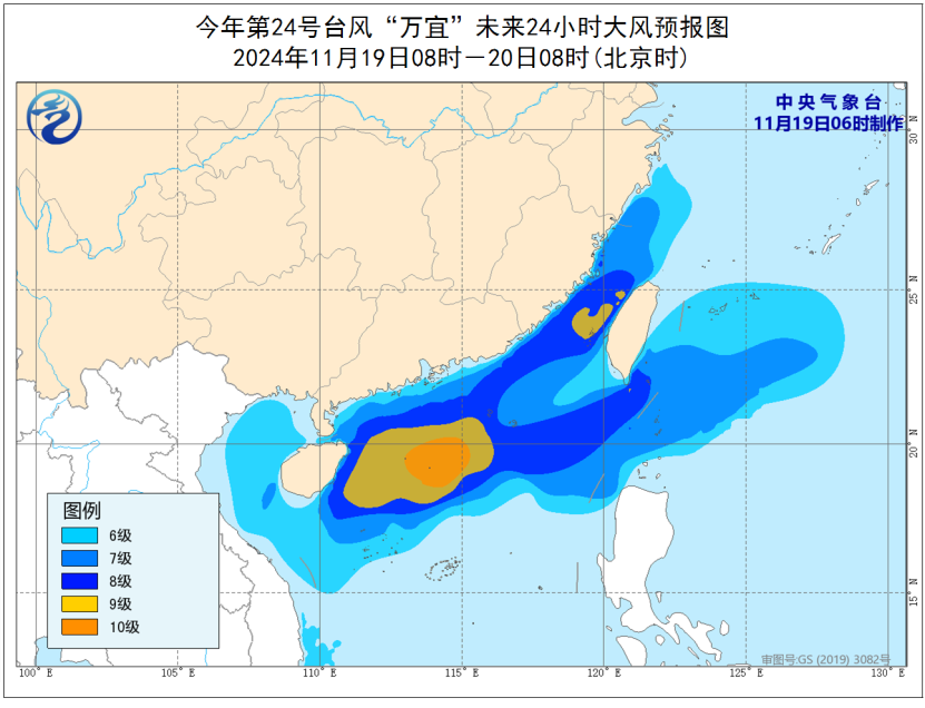 预计今天白天至夜间,我国东部、南部海区及台湾岛沿海、福建沿海、广东沿海、海南岛沿海将有6~8级,阵风9~10级的大风,台湾海峡、南海北部风力可达9级,阵风10~11级,台风中心经过的海域或地区风力有10级,阵风11~12级。明天,南海海域的风力将有所减弱。