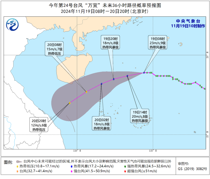 今年第24号台风“万宜”今晨进一步减弱为热带风暴级,今早8时其位于海南省三沙市(西沙永兴岛)东北方向约315公里的海面上,中心附近最大风力9级(23米/秒)。预计,“万宜”将以每小时15~20公里的速度向西偏南方向移动,逐渐向海南岛东部海面靠近;随着海温降低、垂直风切变增大以及干冷空气侵入等因素影响,未来它将快速减弱,可能于20日下午在海南东南部海面消散。受冷空气和“万宜”共同影响,华南及南海有风雨天气。