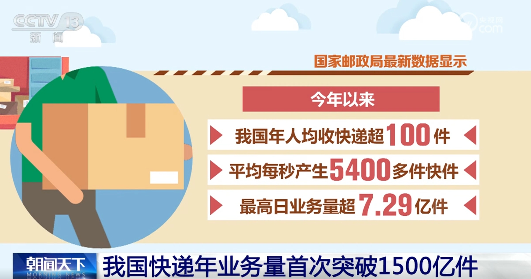 央视网消息:记者从国家邮政局获悉,截至11月17日,我国快递年业务量首次突破1500亿件。数据显示,今年以来,我国年人均收快递超100件,平均每秒产生5400多件快件,最高日业务量超7.29亿件。