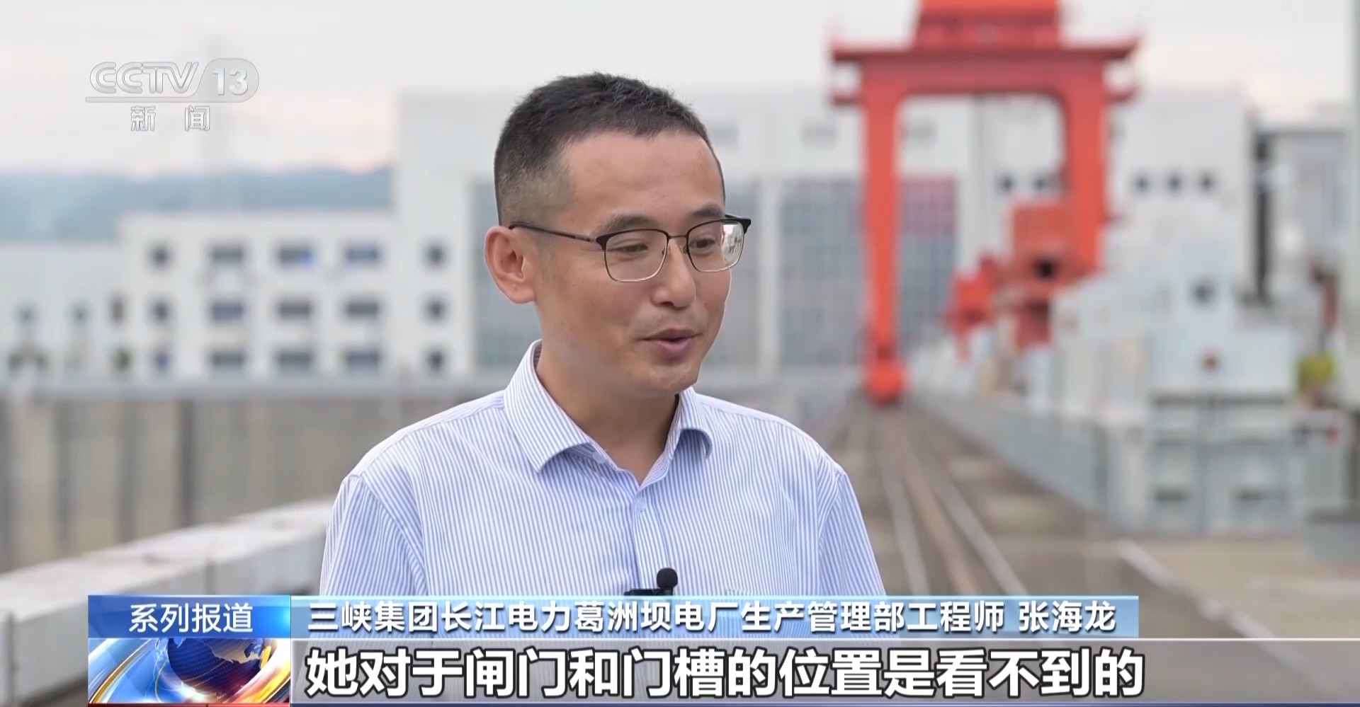 三峡集团长江电力葛洲坝电厂生产管理部工程师 张海龙:司机是在10米以上的高空当中,她对于闸门和门槽的位置是看不到的,所以她依赖于下面的指挥,和其他一些辅助人员来观看。