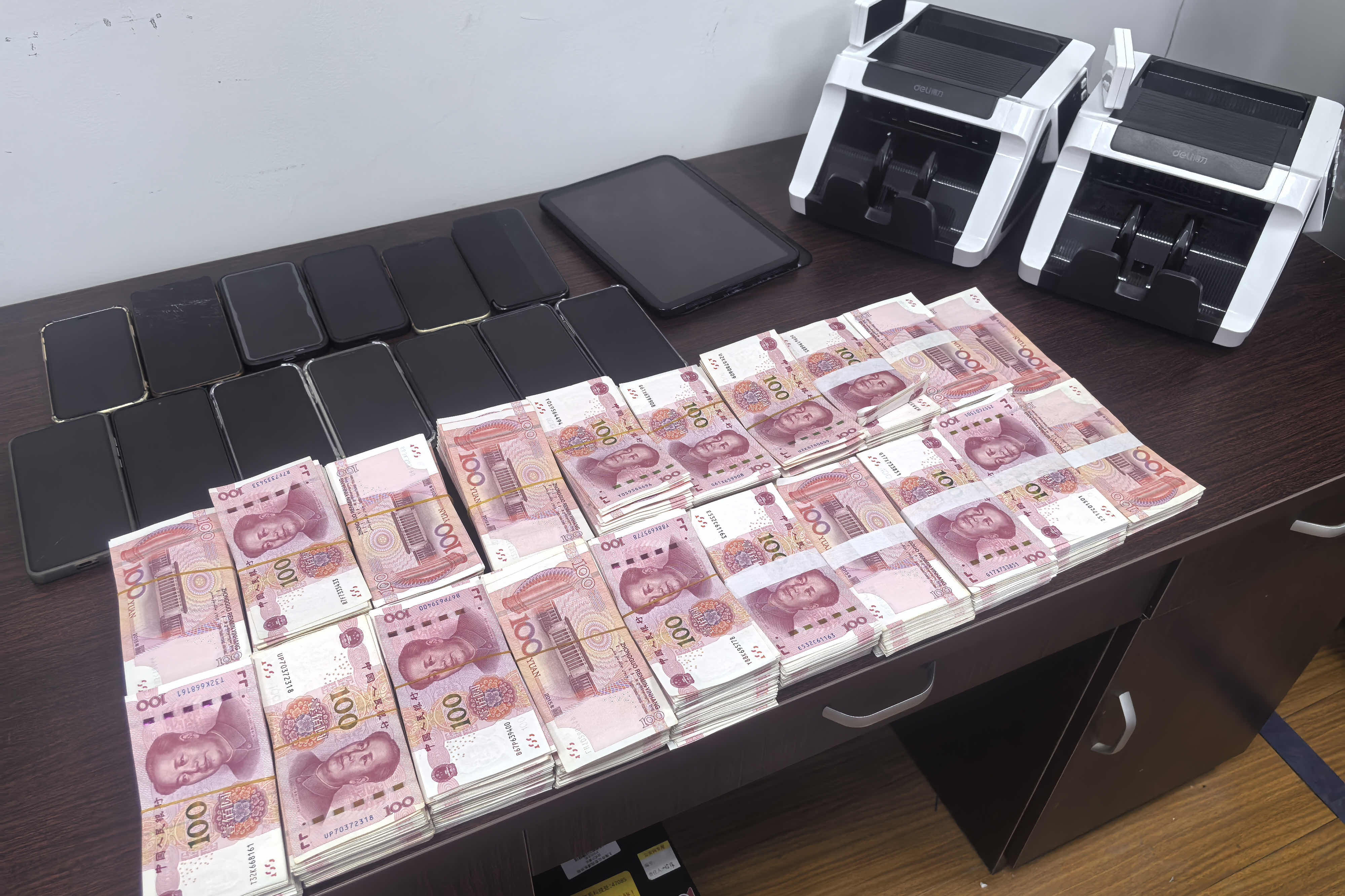 现场缴获的现金、手机及点钞机。上海浦东警方 供图