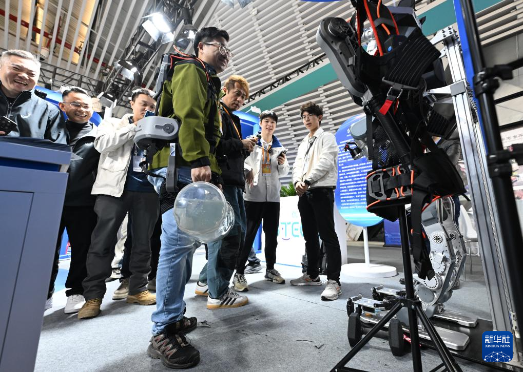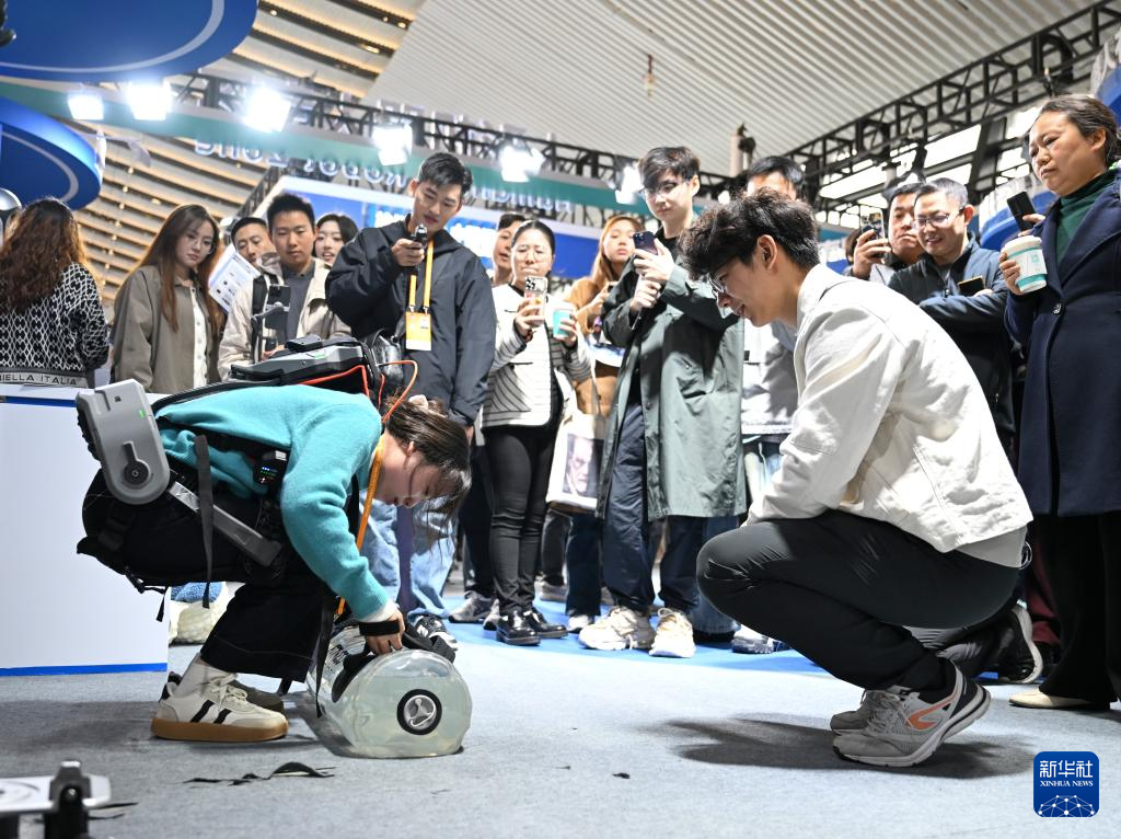 11月19日,在2024年世界互联网大会“互联网之光”博览会人形机器人专区,参观者体验一款外骨骼机器人。