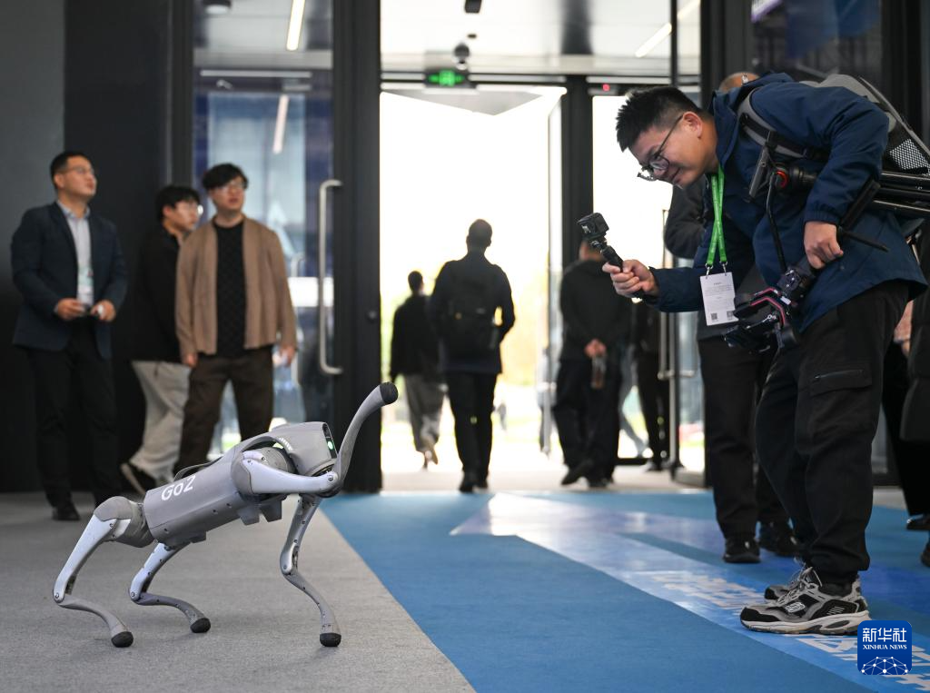 11月19日,在2024年世界互联网大会“互联网之光”博览会上,参观者与一款智能机器狗互动。