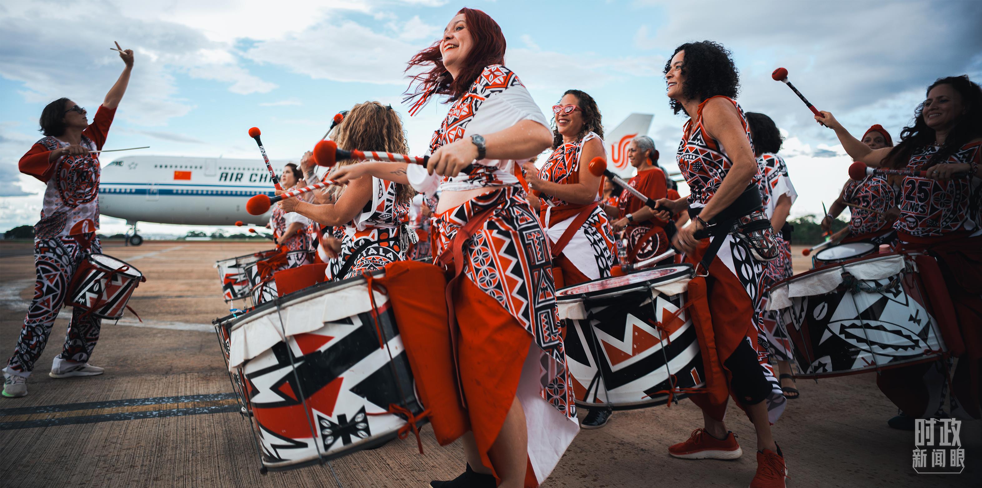 当地时间11月19日下午,习主席乘专机抵达巴西利亚空军基地。巴西政府高级官员热情迎接。几十名巴塔拉艺术家演奏热情奔放的巴西特色鼓乐。