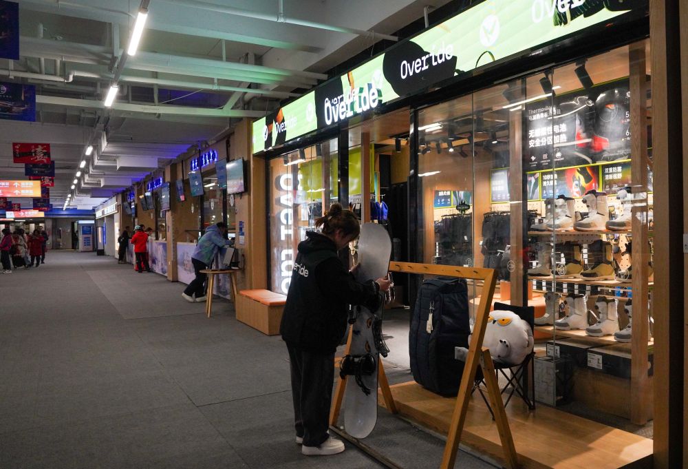 11月15日,在吉林北大湖滑雪度假区商业街内的一家国产品牌雪具店,工作人员在摆放雪板。新华社记者 颜麟蕴 摄