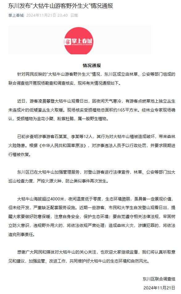 东川区已在大牯牛山加强管理服务,对登山游客进行法律宣传,林草、公安等部门加大巡山检查力度,严控火源火种,防止类似事件再次发生。