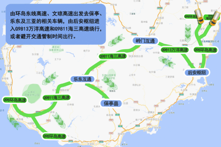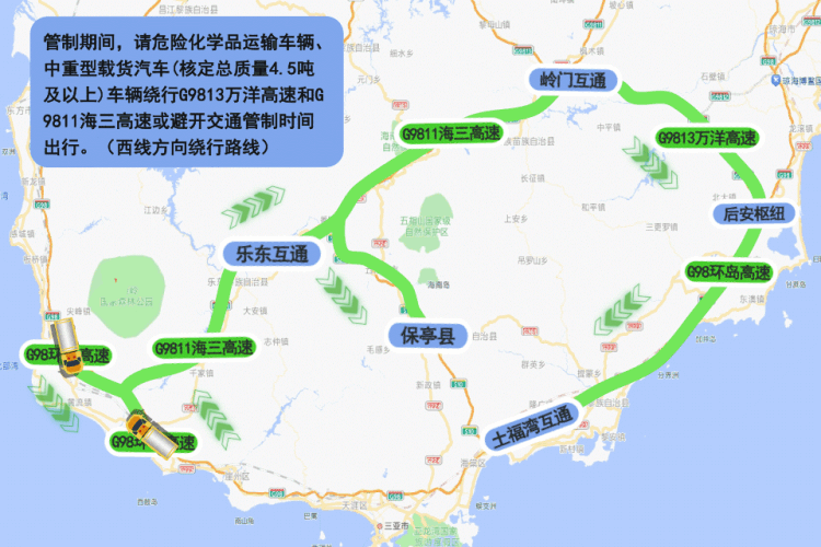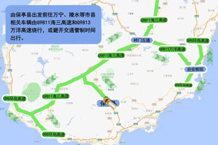 同时,为减轻三亚、陵水地区的道路交通压力,公安机关对过境三亚、陵水的车辆实施远端分流管控措施,目的地非三亚、陵水的车辆,请绕行G9813万洋高速和G9811海三高速或避开交通管制时间出行。