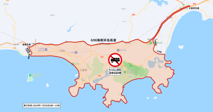 G98高速公路土福湾互通至海角互通以南、三亚市江林路和湾坡路以西、三环西联络线和御海路以东的中心城区内所有道路(含以上道路)。