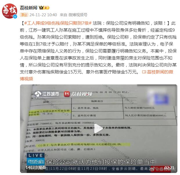 此前,江苏一建筑工人孙某在施工过程中不慎摔伤导致身体多处骨折,经鉴定构成9级伤残。孙某向保险公司索赔时,遭到拒绝。保险公司称,投保单约定了只有伤残等级在1到7级才予以赔付,孙某不满足保单的等级标准。法院审理认为,电子保单中存在限缩保险人义务的行为,保险公司需要履行明确告知义务。本案中,投保人在保险单上盖章是在该事故发生之后,同时建造房屋的房主对保险范围也不知情,所以保险公司没有尽到充分的提示告知义务。最终,法院判决保险公司向孙某支付意外伤害残疾赔偿金15万元、意外伤害医疗赔偿金5万元。