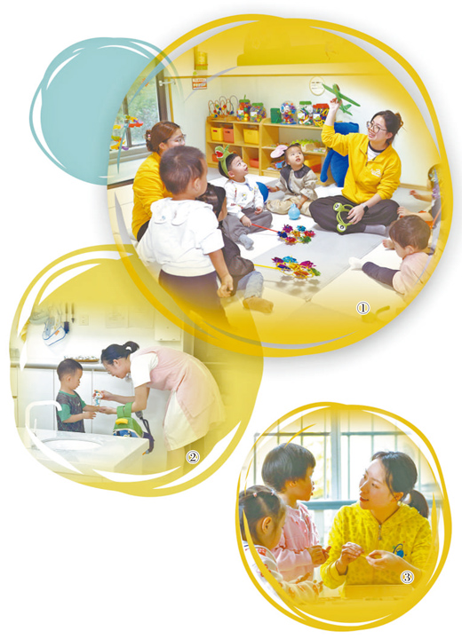 图①:浙江台州路北街道璞悦府小鹤培家庭托育的老师在陪伴孩子。