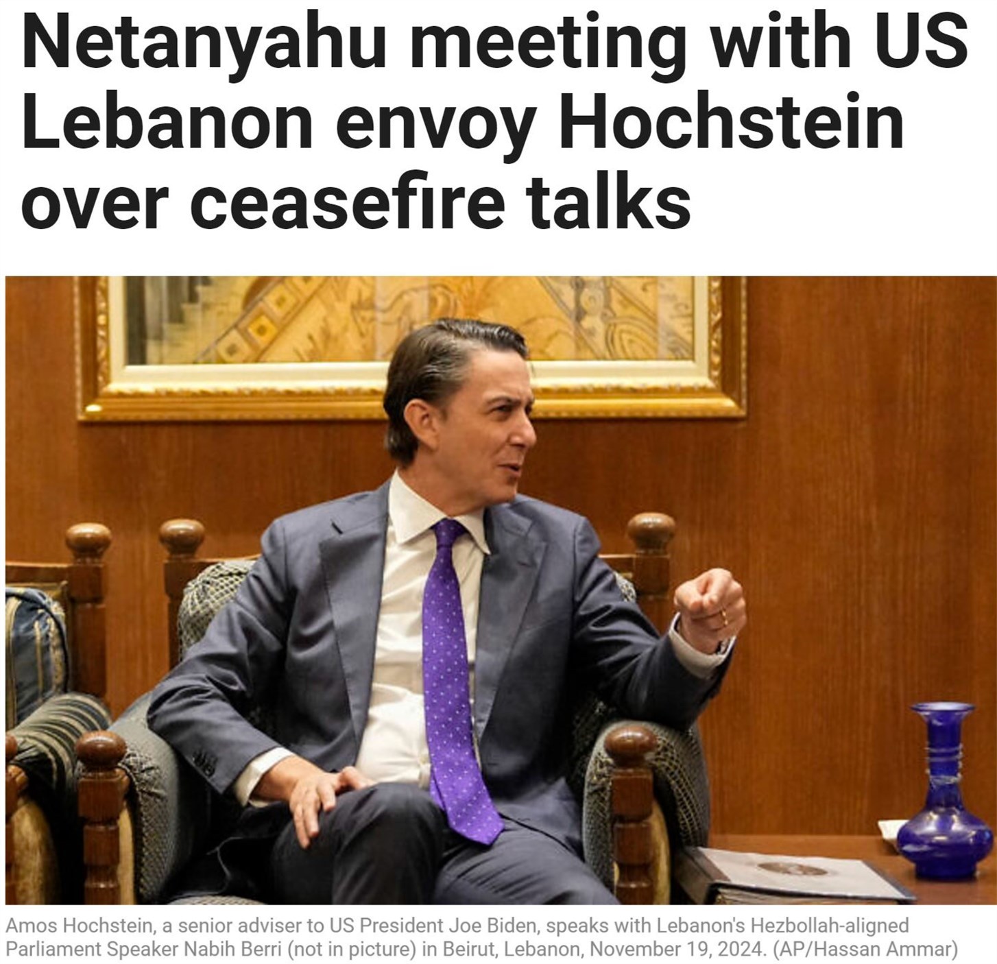 根据以色列官方消息,以色列总理内塔尼亚胡当天与霍克斯坦就以黎停火问题进行了会谈。当天下午,霍克斯坦还会晤了以色列国防部长卡茨和以色列国防军总参谋长哈莱维。