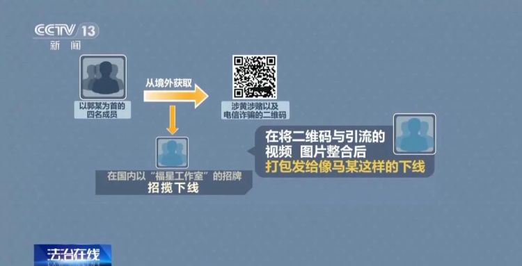 警方对马某电脑中的资料和文档进行了仔细甄别,并与马某的笔录交叉比对,逐渐摸清了“福星工作室”的团伙成员和整个非法引流犯罪链条的结构:以郭某为首的四名成员从境外获取涉黄涉赌以及电信诈骗的二维码,在国内以“福星工作室”的招牌招揽下线,在将二维码与引流的视频、图片整合后,打包发给像马某这样的下线,马某等人再通过招募兼职、自己利用手机、电脑等作案工具将含有引流二维码的“电子小卡片”传播到多个短视频平台及社交软件。