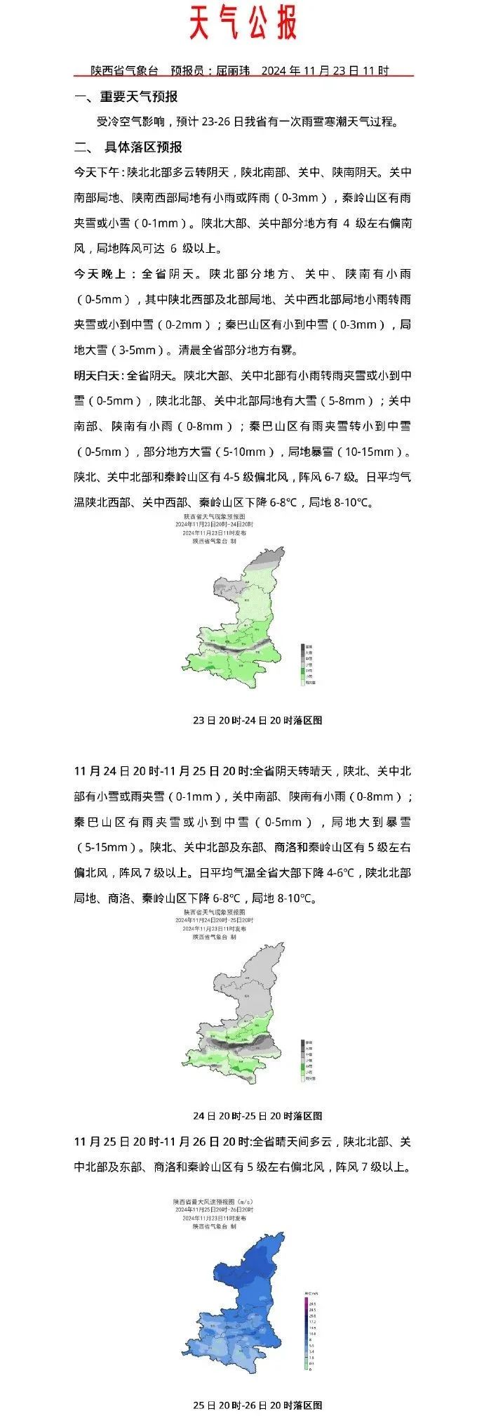 寒潮降温:受较强冷空气影响,我省将出现大风降温天气,预计23日11时至26日11时,日平均气温陕北、关中北部及西部、秦巴山区下降8~10℃,其中陕北北部局地、秦岭山区局地下降10~12℃,关中东部及南部、陕南下降6~8℃。预计最低气温陕北南部、关中、陕南出现在26日凌晨,陕北南部-7~-12℃,关中北部及西部-5~-9℃,关中东部及南部-3~-5℃,秦岭山区-10~-15℃,商洛-5~-7℃,汉中、安康-1~-4℃;陕北北部最低气温出现在27日凌晨,-7~-14℃。