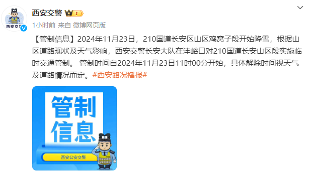 11月23日,西安交警发布管制信息称,2024年11月23日,210国道长安区山区鸡窝子段开始降雪,根据山区道路现状及天气影响,西安交警长安大队在沣峪口对210国道长安山区段实施临时交通管制。