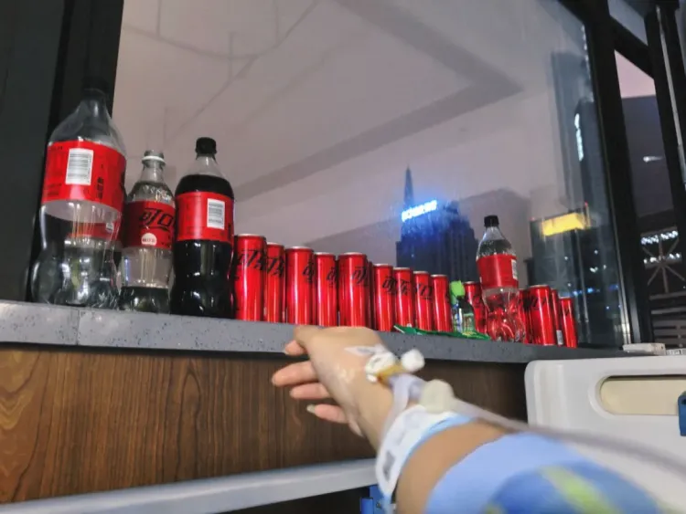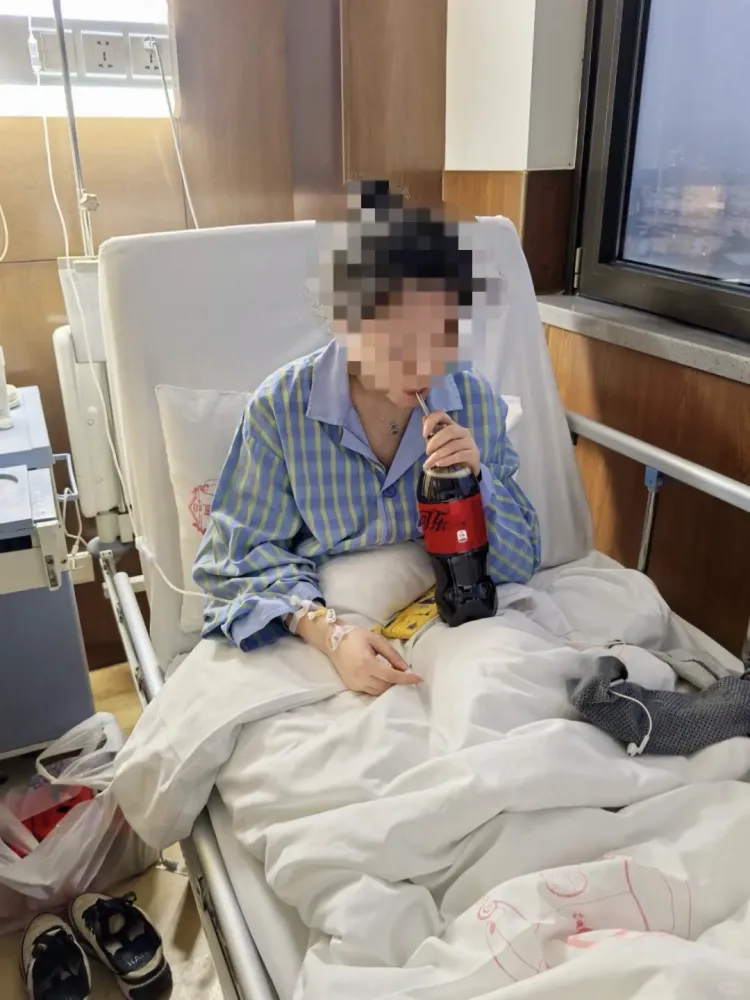 江女士在病床上喝可乐(受访者供图)