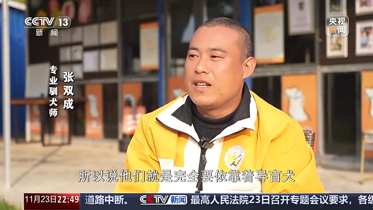 专业驯犬师 张双成:当有了导盲犬以后,盲杖就会被抛弃了,所以说他们完全要依靠着导盲犬,就是互相信任。现在盲人对它们就像待自己的眼睛一样,和孩子一样,对它们也都非常好。希望咱们都互相多包容、多体谅,互相对盲人多一些认识吧。