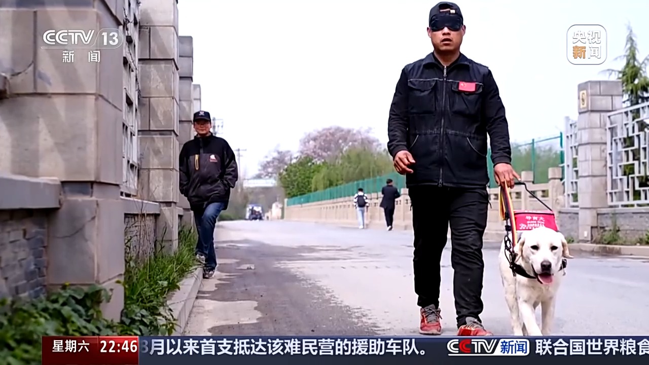 专业驯犬师 张双成:在这个过程当中,自己把眼睛蒙起来,突然间就感觉自己失去了一切一样。出门的时候没有方向感,脚又不稳,尤其是这个车从身边过去的时候,就特别恐惧害怕。包括自己会摔倒,磕磕碰碰,对我来说感触挺大的。在通过跟盲人交谈,他们都有哪些困难,然后综合整理了几个驯犬方法,融入到我们现在这个导盲犬身上。