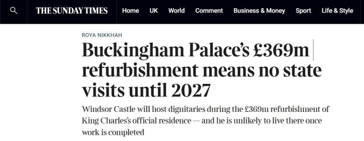 △《星期日泰晤士报》:白金汉宫将耗费3.69亿英镑进行翻修,直至2027年都不会承接国事访问