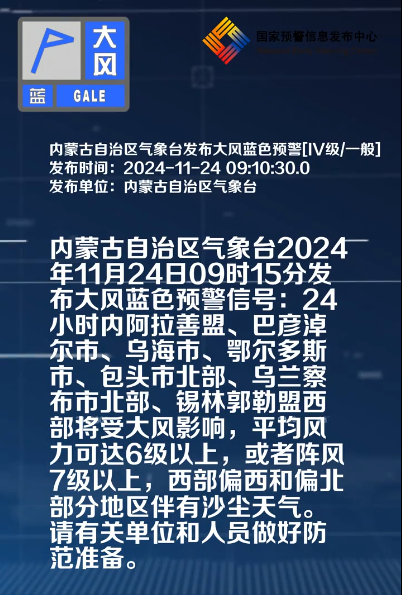 内蒙古自治区气象台2024年11月24日09时15分发布大风蓝色预警信号:24小时内阿拉善盟、巴彦淖尔市、乌海市、鄂尔多斯市、包头市北部、乌兰察布市北部、锡林郭勒盟西部将受大风影响,平均风力可达6级以上,或者阵风7级以上,西部偏西和偏北部分地区伴有沙尘天气。请有关单位和人员做好防范准备。