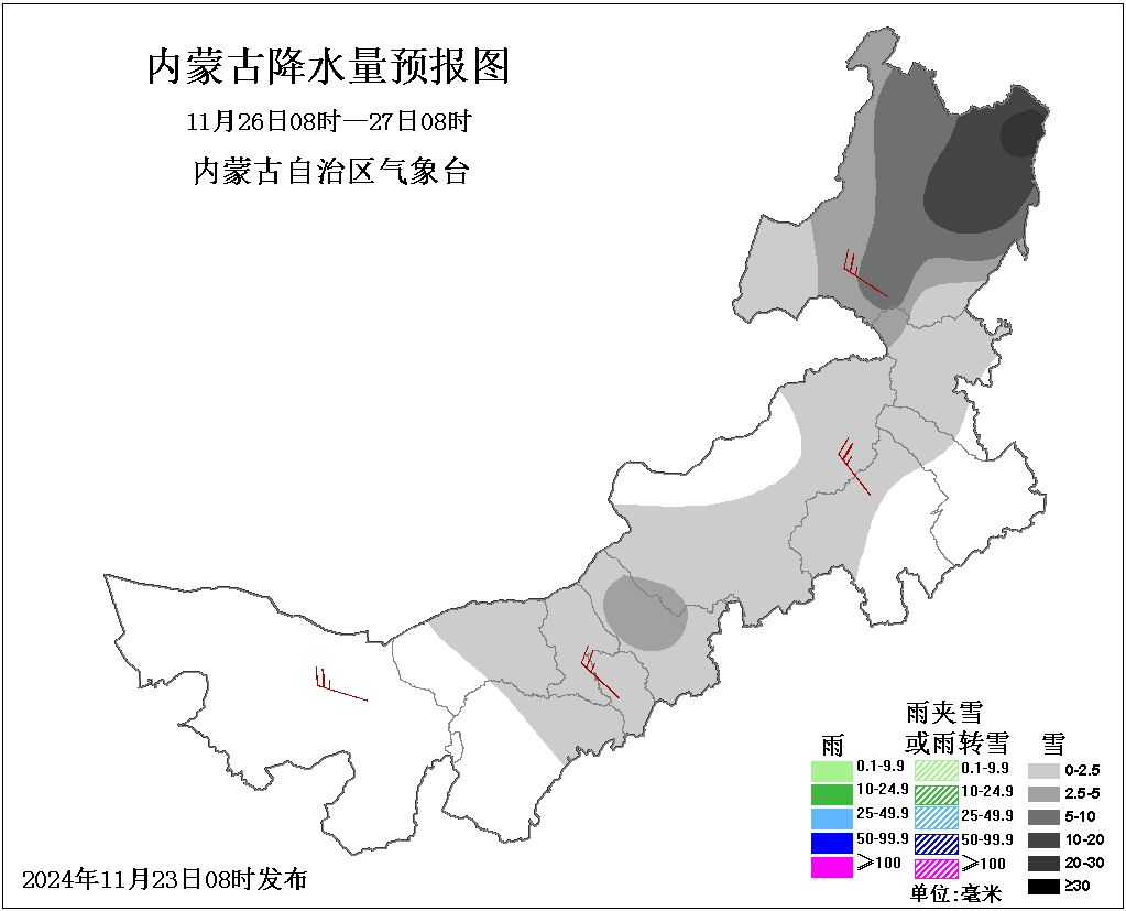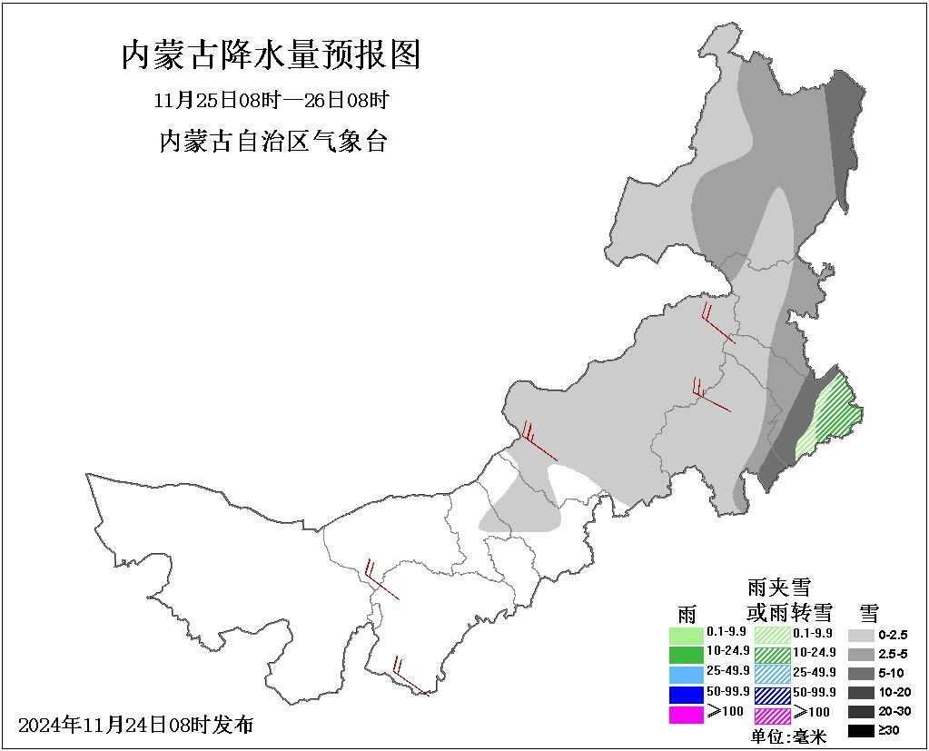 25日08时至26日08时,我区西部偏东和中东部大部地区多云,有小雪或雨夹雪,其中,赤峰市东南部、通辽市大部、兴安盟西北部和东部、呼伦贝尔市中部和东部有中雪或雨夹雪,赤峰市东南部、通辽市东部、呼伦贝尔市东北部有大雪或雨夹雪,局地暴雪,其余地区晴间多云;西部偏东、中部大部和东南部地区4、5级短时6、7级局地8级西北风;中东部大部地区气温下降8~10℃,中部偏东和东南部地区气温下降10~12℃,局地气温下降12℃以上。