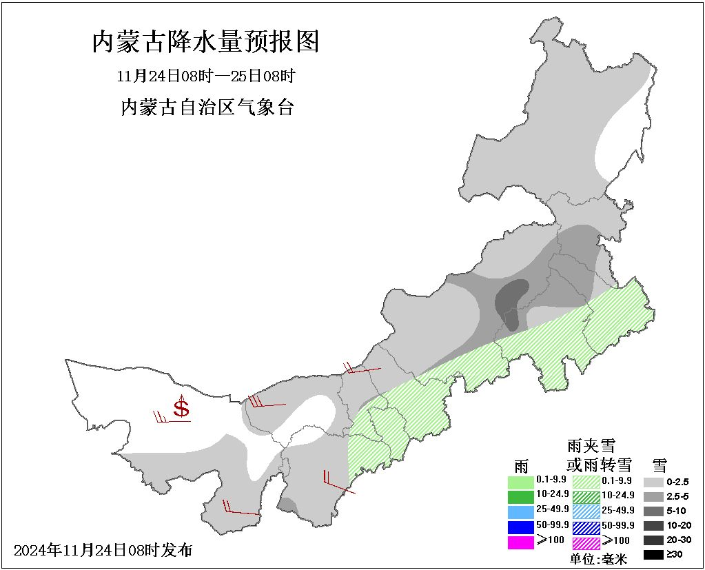 24日08时至25日08时,全区大部地区多云,阿拉善盟南部、巴彦淖尔市北部和东部、乌海市、鄂尔多斯市大部及以东至呼伦贝尔市大部有小雪或雨夹雪,其中,鄂尔多斯市西南部、包头市南部、呼和浩特市大部、乌兰察布市大部、锡林郭勒盟南部和东部、赤峰市北部、通辽市西北部、兴安盟南部地有中雪或雨夹雪,锡林郭勒盟东部偏东、赤峰市西北部有大雪或雨夹雪;中西部大部地区5、6级短时7、8级局地9级西北风,西部偏西地区局地伴有沙尘天气;中西部大部地区气温下降6~8℃,西部偏东北和中部偏西地区气温下降8~10℃,局地气温下降10℃以上。
